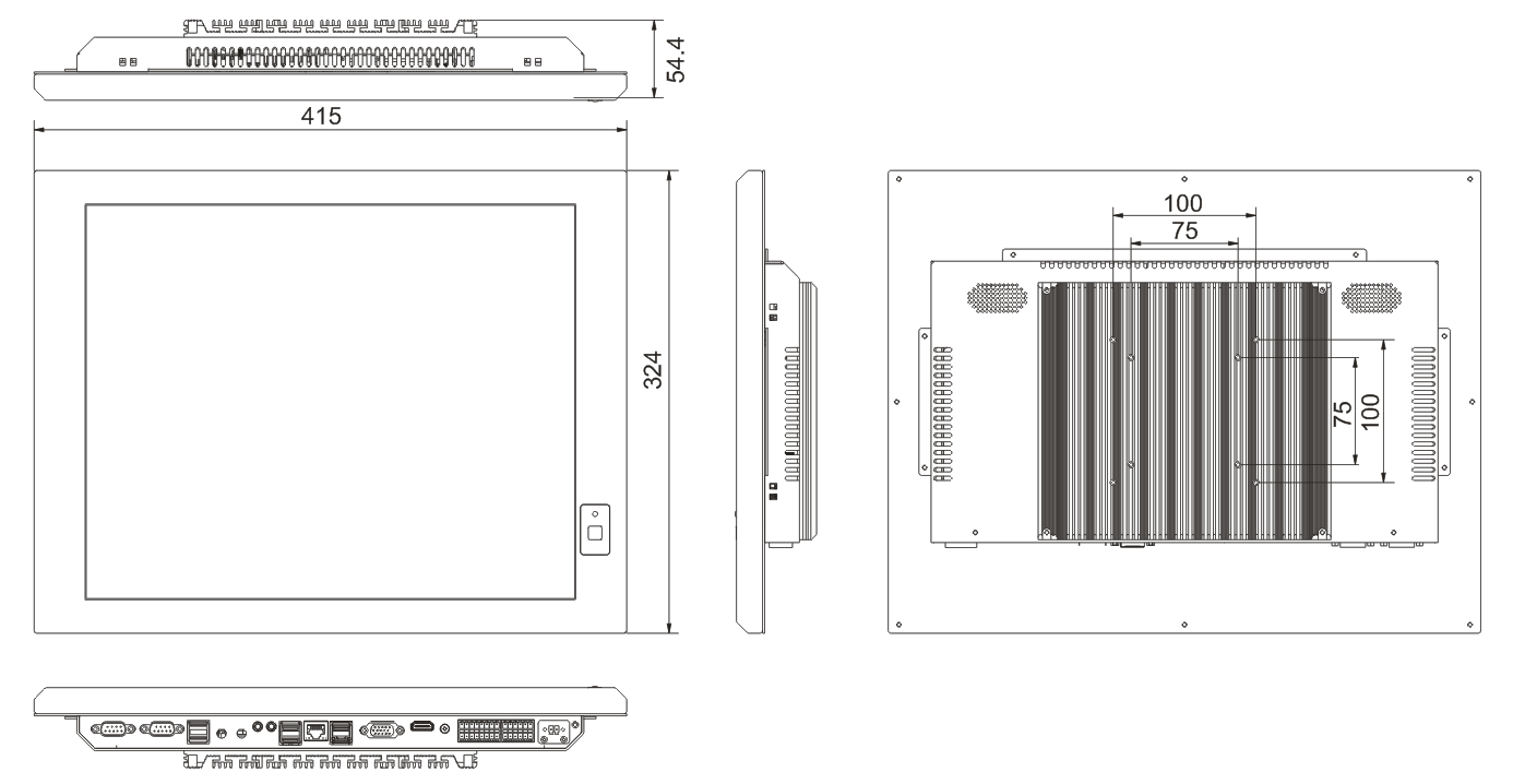 4*RS-232, 2*RS422/485,2個DB9接口RS485/422 4個三線RS-232, 2*USB2.0,2*USB3.0, 1*14BIT GPIO端口, 1*LINE OUT 1*MIC, 2*Wifi天線接口, 1*按鈕開關, 1*VGA 最大分辨率支持2048x1536 1*HDMI 最大分辨率支持3200*2000@60HZ |